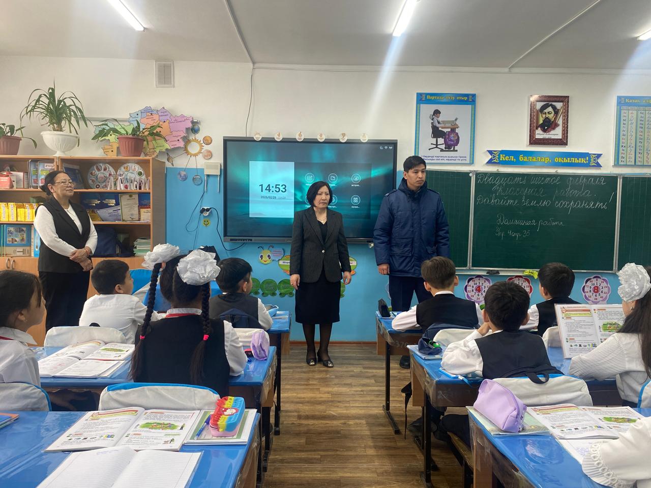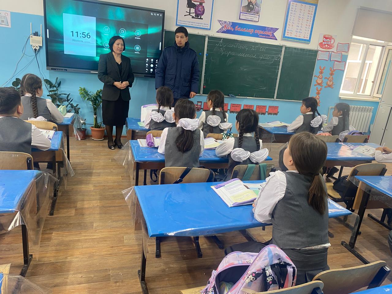 "Қауіпсіз қоғам" құқықбұзушылықтың алдын алу жұмыстары бойынша тәрбие жөніндегі орынбасар Такенова А.С. және мектеп инспекторы Сүлейменов Нұрлан сыныптарда түсінік жұмыстарын жүргізді.