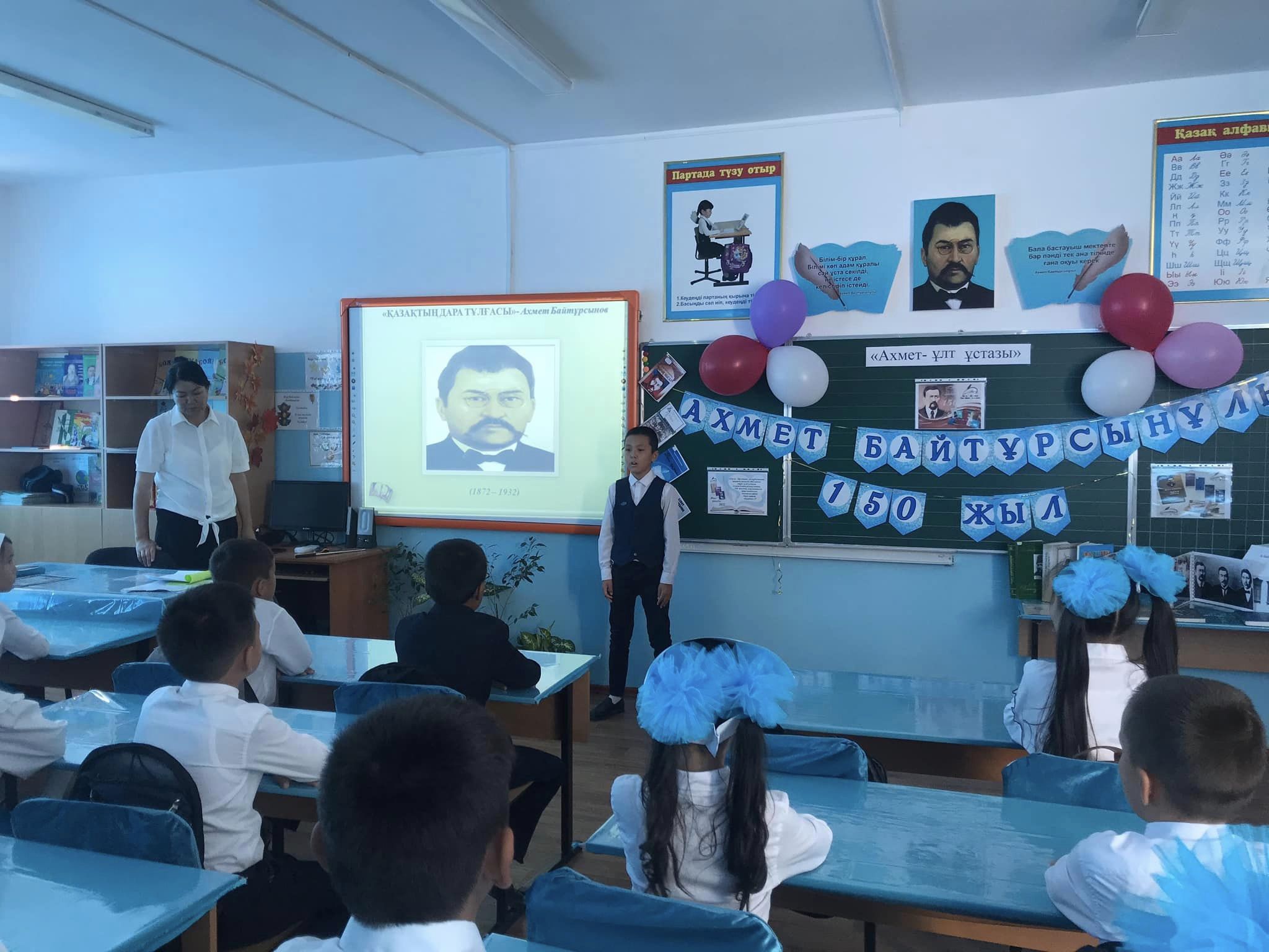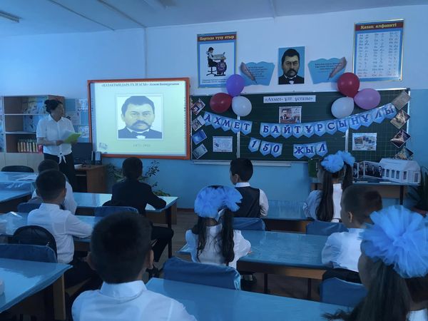 Мектебімізде Қазақстан халқы тілдері күніне және Ахмет Байтұрсыновтың туғанына 150 жыл толуына байланысты іс-шаралар жоспары жасақталып өткізілуде.Соның бірі 4-ші "Б" сынып жетекшісі Анетбаева Тілектестің сыныбымен өткізген "Ахмет - ұлт ұстазы" тақырыбындағы тәрбие сағаты.Тәрбие сағатында Ахмет Байтұрсынов өмірі мен шығармашылығы келер ұрпаққа мәңгілік өнеге болып қала беретінін, Ахмет Байтұрсынов рухына мәңгі бас иіп өтетінімізді түсіндірді.