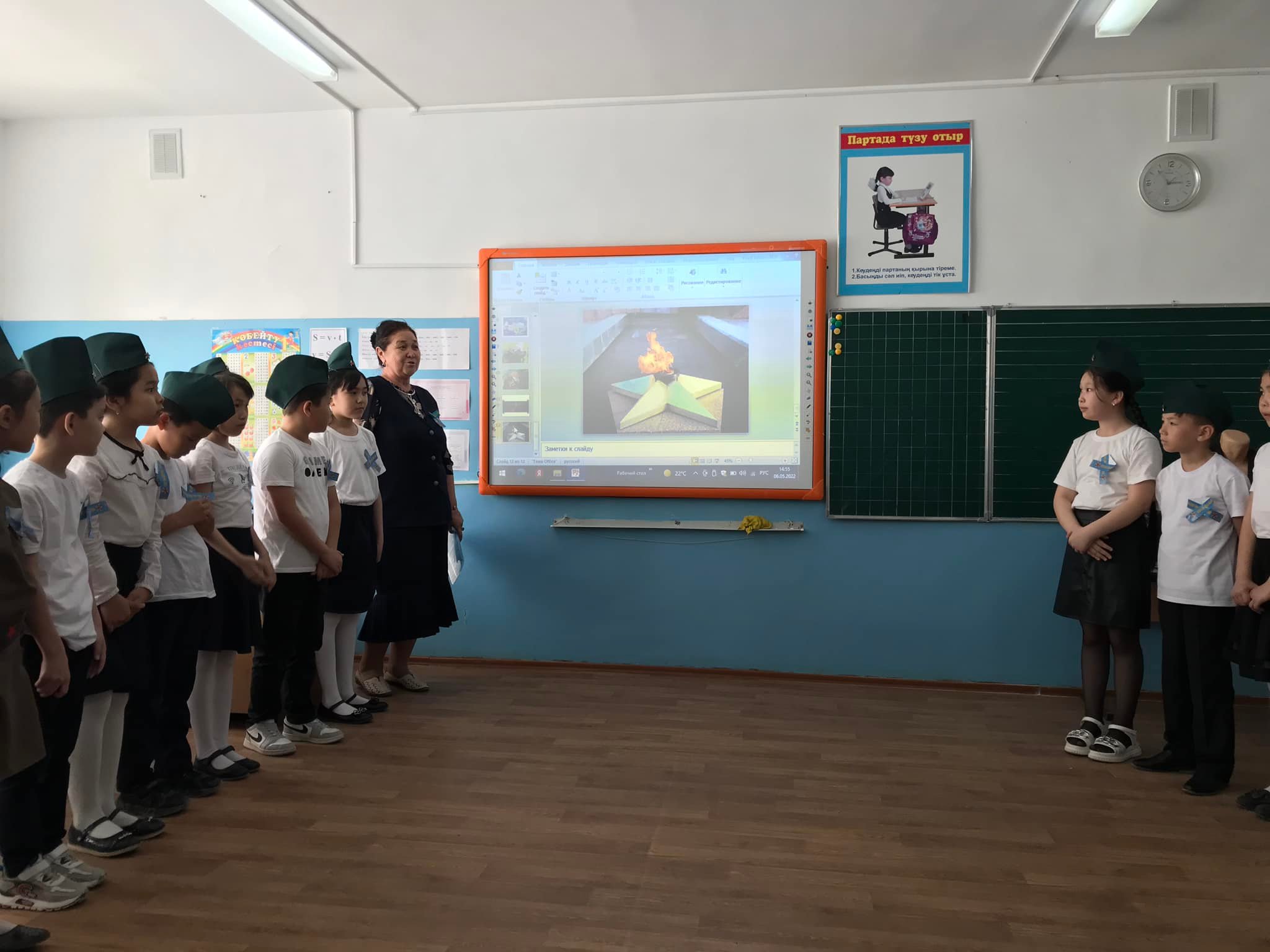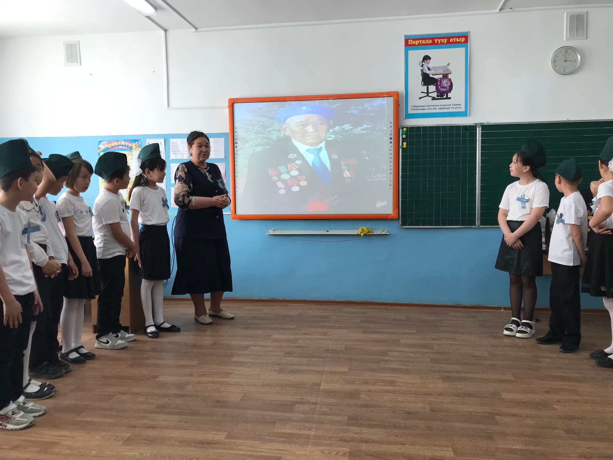 3 "А" сынып жетекшісі Джайлыбаева Нина Жеңіс күніне орай "Бейбіт күн жасасын әлемде!" тақырыбымен тәрбие сағатын өткізді. Ұлы Отан соғысына қатысқан Қазақстандық батырлар, 28 Панфиловшылар дивизиясы туралы әңгімелеп, оқушылар тақпақтар мен әндер айтты.