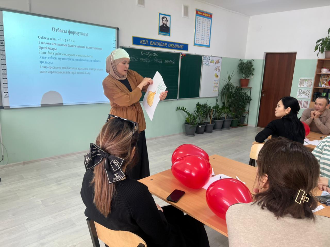 Тәрбие жұмысының "Отбасы" бағытының жылдық жоспары бойынша 3-ші "А" сынып жетекшісі Косниязова Толқын Абайқызы ата-аналармен "Отбасы өнегесі - Отан өнегесі" тақырыбында тренинг өткізді. Тренингте бала тәрбиесіне байланысты сұрақ-жауап, жағдаяттан шығу жолдары, аңыз әңгімелер, бала тәрбиесіне байланысты бейнеролик көрсетілді. "Аялы алақан" ойыны ойналды. Тренинг өз дәрежесінде жақсы өтіп, ата-аналар ризашылықтарын білдірді.