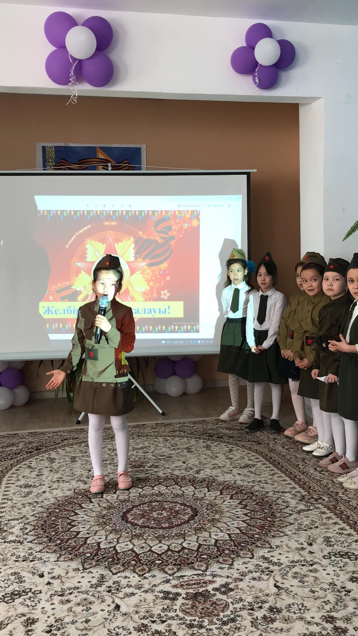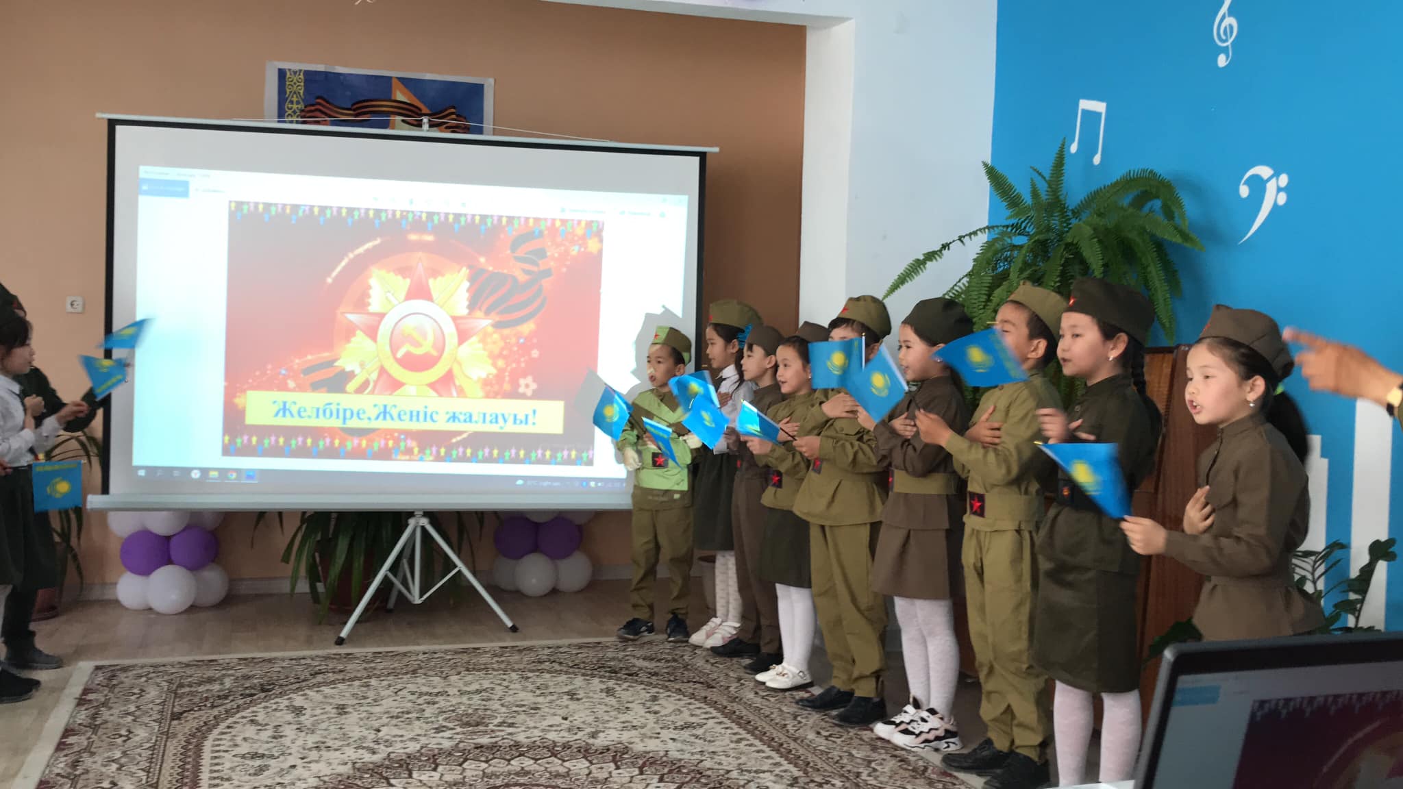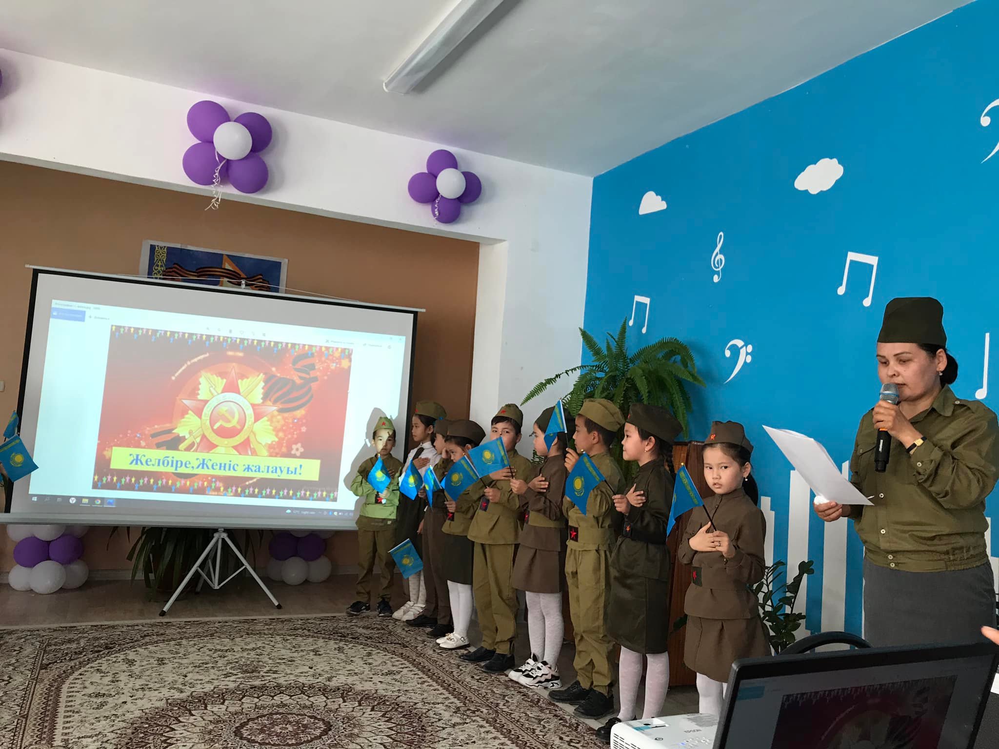 "Желбіре Жеңіс жалауы!" тақырыбындағы тәрбие сағатын 2 "Д" сынып жетекшісі Мұстапаева Жанар өткізді.Тәрбие сағатын "Атамекен" әнімен бастап, "Жойылсын соғыс" әні, "Катюша" биі, әндер,тақпақтар айтылды.